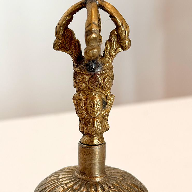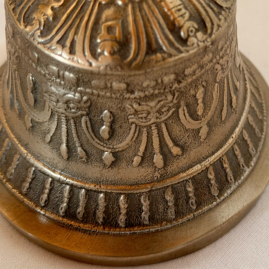 The bell, measuring 14 cm, produces a clear, resonant tone that symbolizes wisdom and emptiness, while the dorje, at 11 cm, represents compassion and skillful means. Together, they embody the union of wisdom and method, a central principle in Vajrayana practice.
