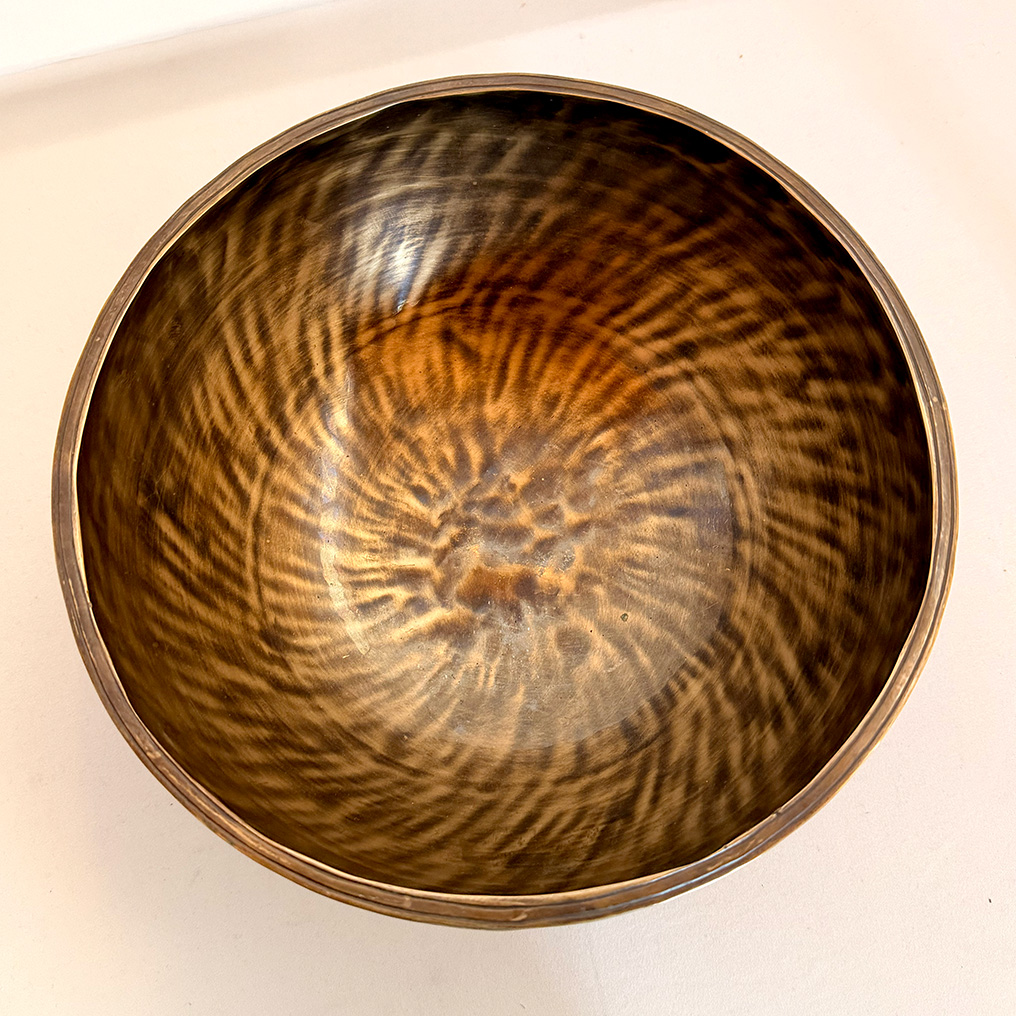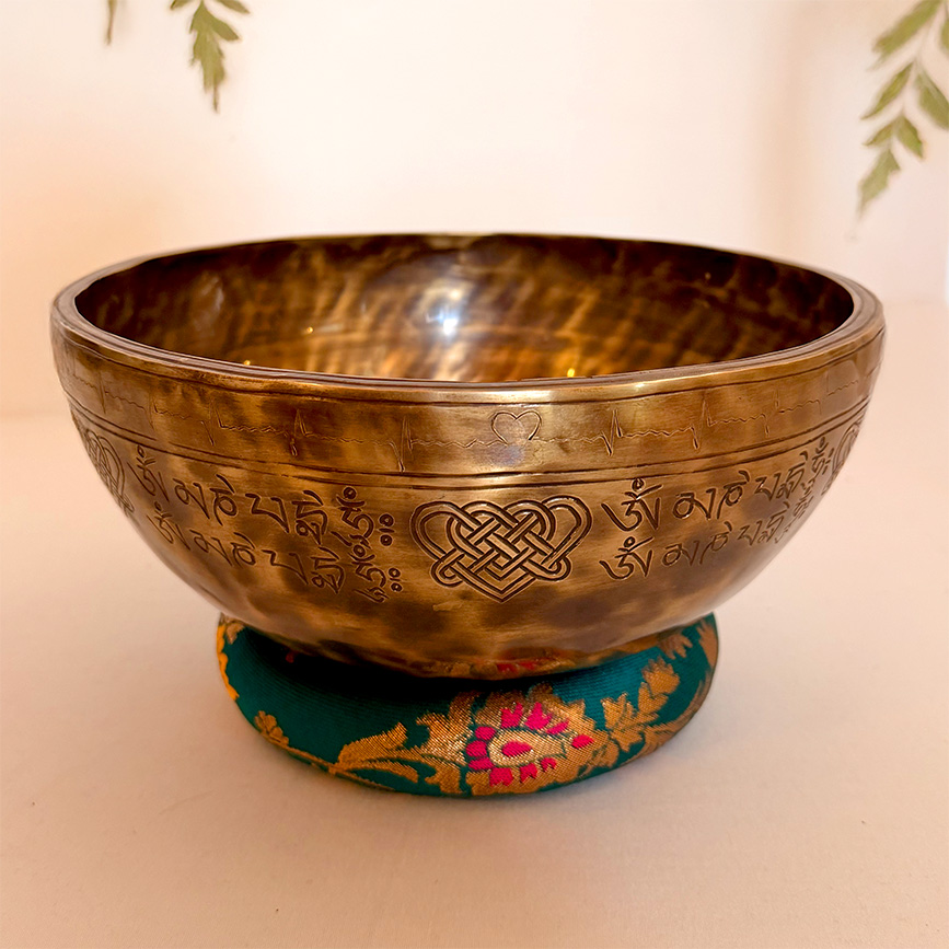 This handcrafted singing bowl features a beautiful hand-etched heart motif combined with a rippled interior finish, creating both visual and sonic elegance. The rippled texture enhances the bowl’s resonance, producing rich, layered tones that are soothing, immersive, and full of harmonic depth.