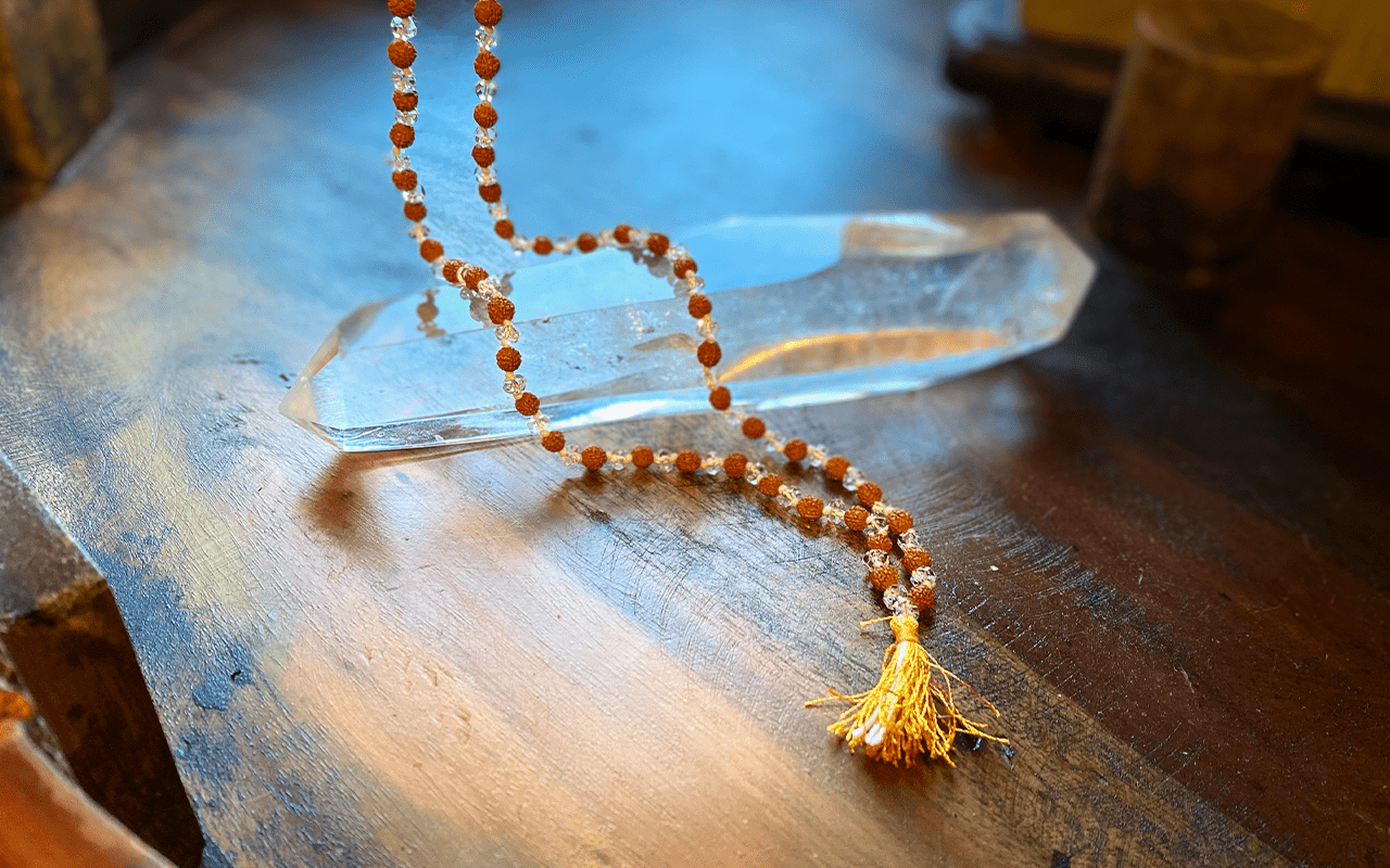 Clear Quartz: The “Master Healer,” clear quartz amplifies energy, thoughts, and intentions while harmonizing beautifully with rudraksha’s earthy vibration.