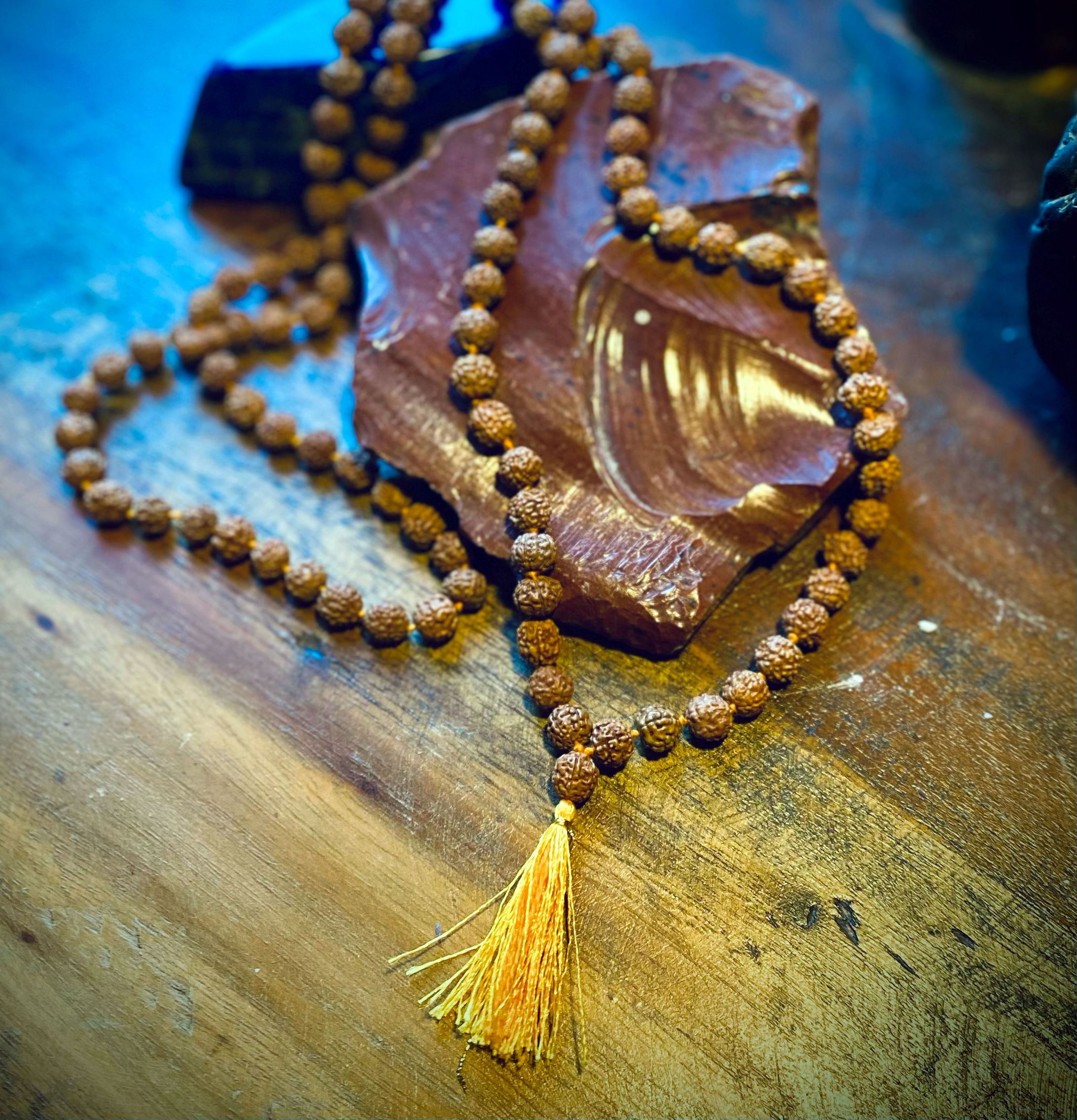 Each rudraksha seed is carefully selected to highlight its natural beauty while maintaining its spiritual potency. The mala is hand-knotted for durability and ease of use during meditation or handling.
